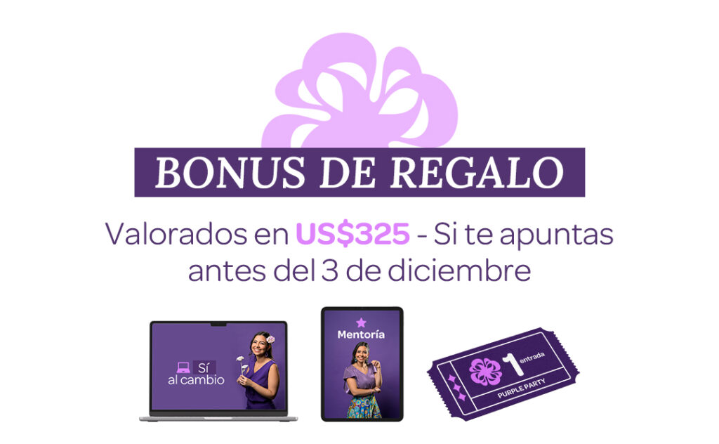 Si te sumas antes del 3 de diciembre recibes estos bonus >> Masterclass "Sí al cambio" una guía para atreverte a vivir de lo que te enciende + 1 entrada a la Purple Party, el evento presencial con conferencistas especiales